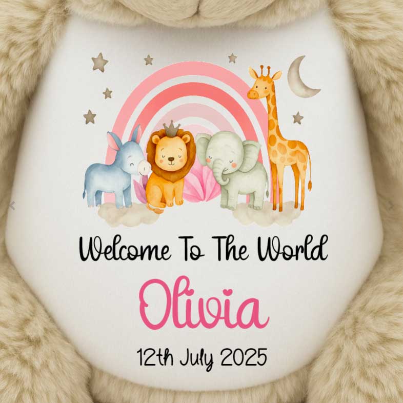 Choose from 28 soft, cuddly styles including brown bears, pink bears, blue bears, white bears, angel bears, grey bunnies, pink bunnies, elephants, lions, giraffes, highland cows, koalas, sloths, penguins, owls, dragons, unicorns, orangutans, lambs, kangaroos, cats, cows, dogs, and reindeer.