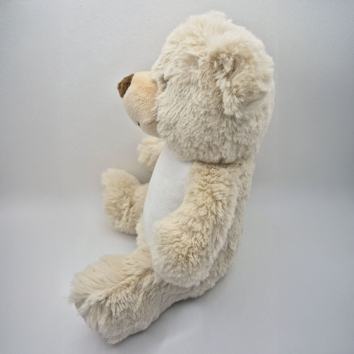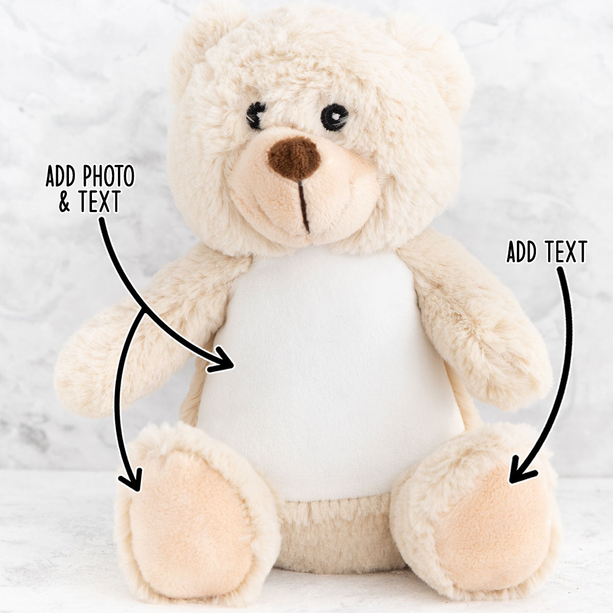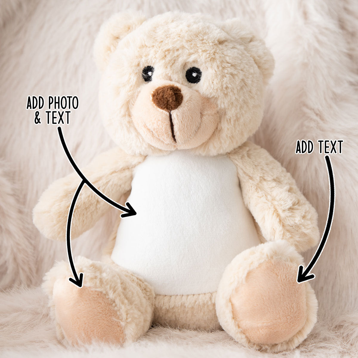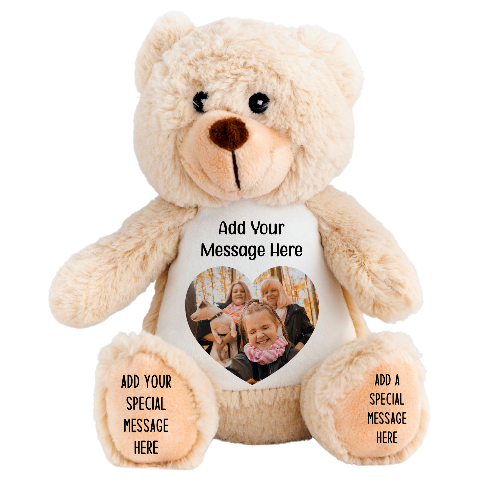This cuddly brown teddy bear is made from 100% soft polyester plush, with a friendly stitched face and velvety beige paws. Its smooth white tummy and feet are fully personalisable — perfect for adding a photo, name, message, or date.