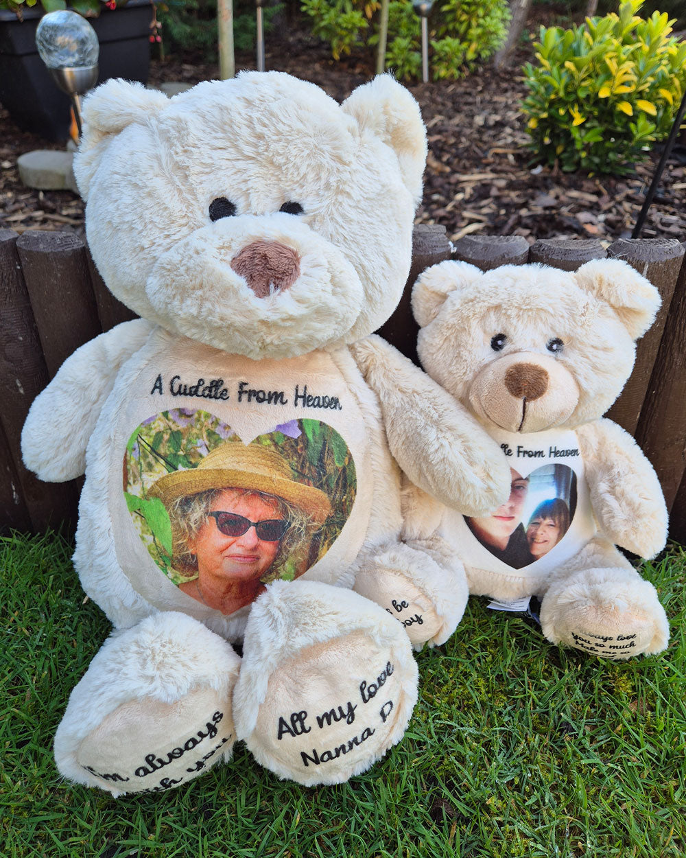 They’re the same quality teddies our customers already love — simply larger, with a more generous tummy and feet area for personalisation. Whether you’re adding a favourite photo, name, date, or message, the larger print space allows for greater detail and impact.